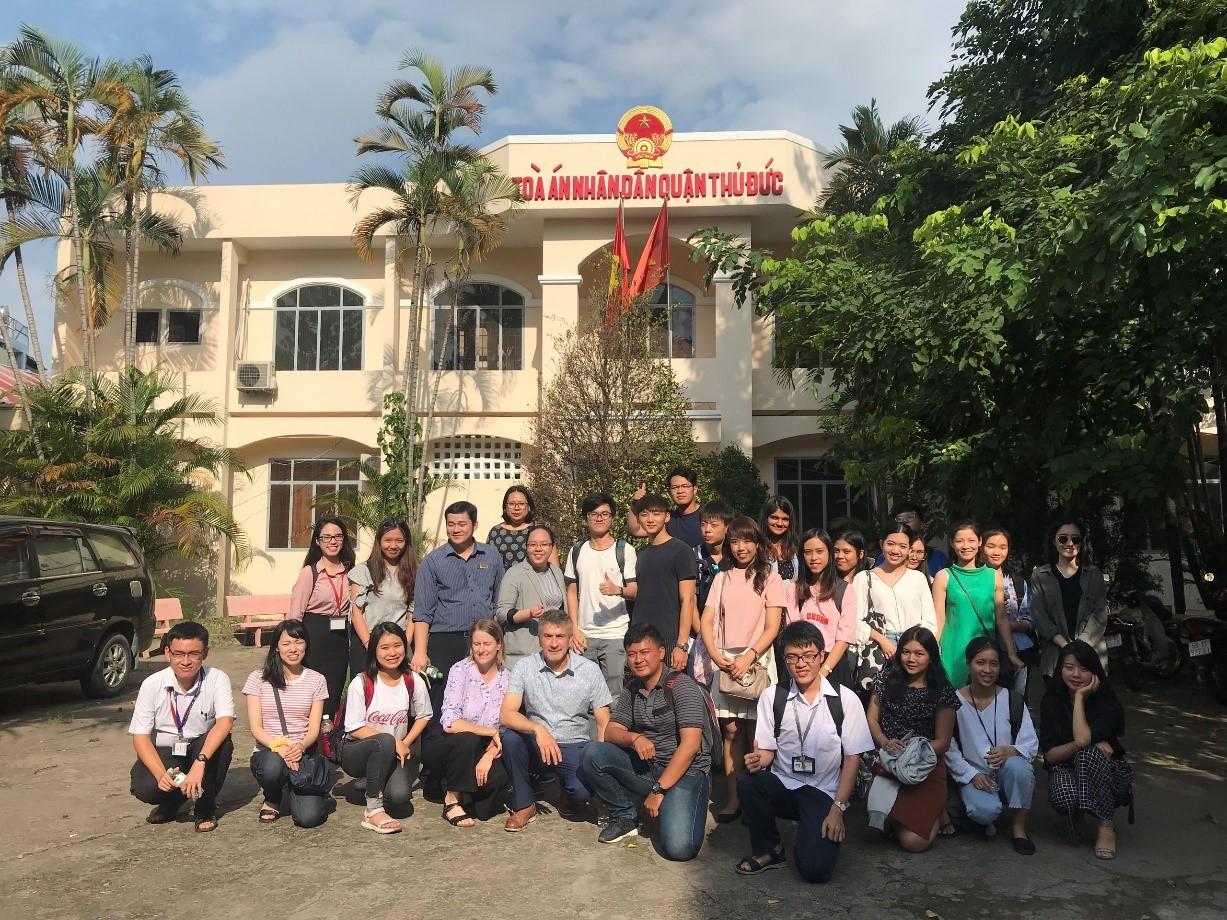Các học viên cũng đã có cơ hội tham quan và học tập thực tế tại Tòa án nhân dân quận Thủ Đức vào ngày 13.8.2019. Phó chánh án Tòa án nhân dân quận Thủ Đức - Ông Nguyễn Vũ Trọng Đan đã giới thiệu về lịch sử hình thành, phát triển của Tòa án, đồng thời khái quát sơ lược về hệ thống tư pháp Việt Nam đến các bạn học viên quốc tế. Bên cạnh đó, ông cũng giải đáp những thắc mắc của các học viên về sự khác nhau trong hệ thống tư pháp giữa các quốc gia. Hai bên đã có một buổi trao đổi, thảo luận cởi mở và nhiệt tình về những vấn đề liên quan đến thực tiễn xét xử tại Tòa, đặc thù, tính chất công việc tại các vị trí trong Tòa, đồng thời, tham quan các phòng ban và khu vực xét xử tại Tòa.