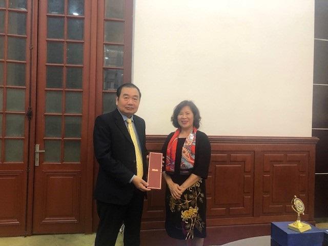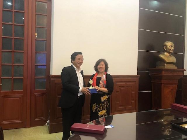 Bà Nguyễn Thúy Hiền, Phó Chánh án Tòa án Nhân dân Tối cao nhận và trao quà lưu niệm cho các thành viên đoàn công tác Trường Đại học Kinh tế - Luật, ĐHQG-HCM.