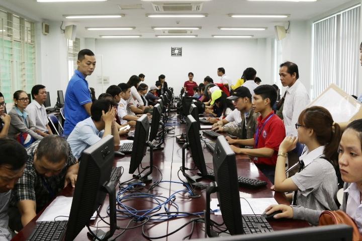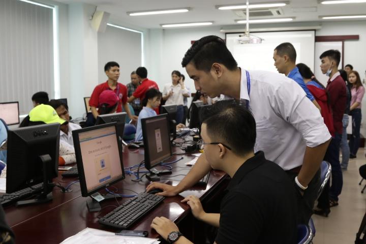 Từ 7 giờ sáng, lượng tân sinh viên và phụ huynh đã có mặt đông đúc ở Trường. Các em được hướng dẫn đến lần lượt từng khu vực để hoàn tất các bước trong quy trình hoàn tất thủ tục nhập học một cách khoa học.