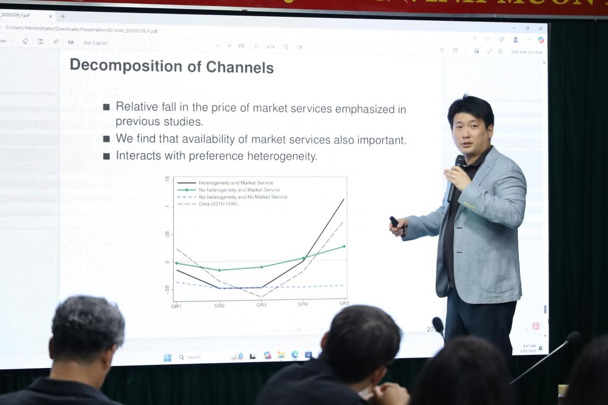 PGS.TS Youngjae Lee - Giảng viên Khoa Kinh tế của KNU đã trình bày nghiên cứu về mối quan hệ giữa bất bình đẳng thu nhập và quyết định sinh con của các hộ gia đình, đặc biệt là phụ nữ có trình độ cao. Nghiên cứu cho thấy sự chênh lệch thu nhập ngày càng tăng có ảnh hưởng đáng kể đến tỷ lệ sinh, từ đó đặt ra những câu hỏi quan trọng về tác động dài hạn đến chất lượng nguồn nhân lực và tăng trưởng kinh tế.