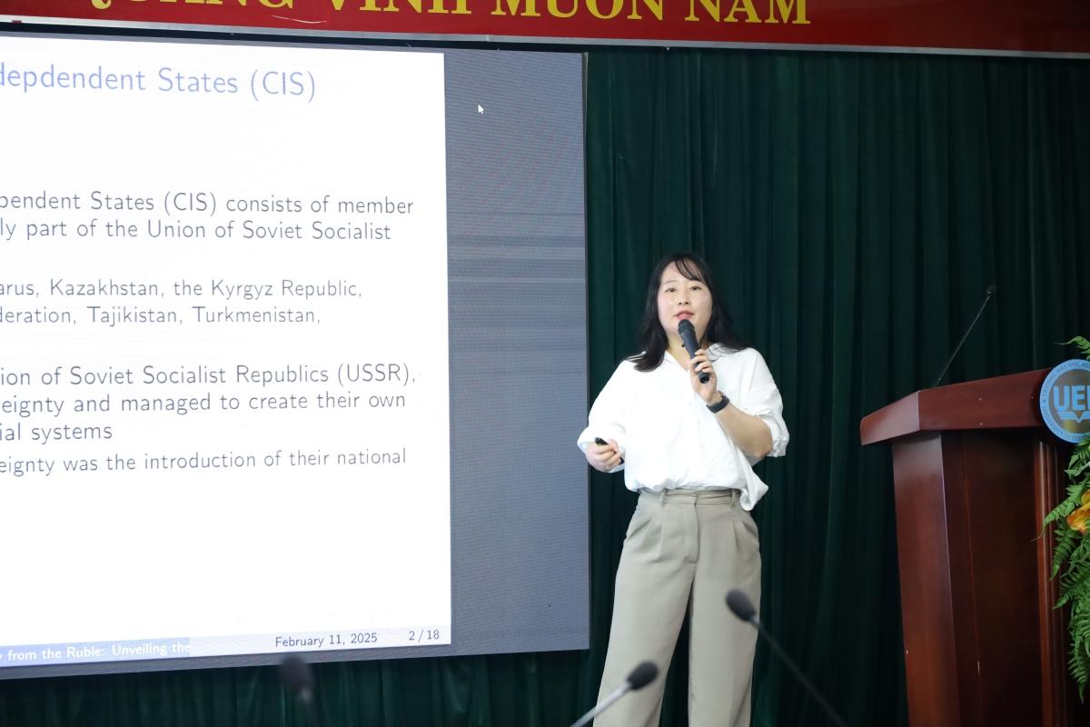 Đồng thời PGS.TS Bo-Young Choi - Giảng viên Khoa Kinh tế quốc tế của KNU đã phân tích cách thức mà sự biến động tỷ giá ảnh hưởng đến thương mại giữa các quốc gia thuộc Cộng đồng các Quốc gia Độc lập (CIS). Kết quả nghiên cứu cho thấy, mặc dù nhiều quốc gia trong khu vực này tuyên bố tỷ giá thả nổi, nhưng trên thực tế, họ vẫn can thiệp để ổn định đồng tiền, từ đó giúp giảm thiểu rủi ro và thúc đẩy thương mại nội khối.