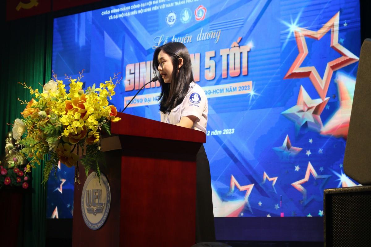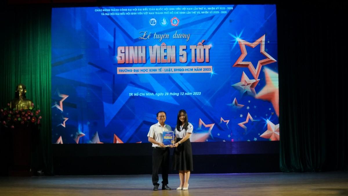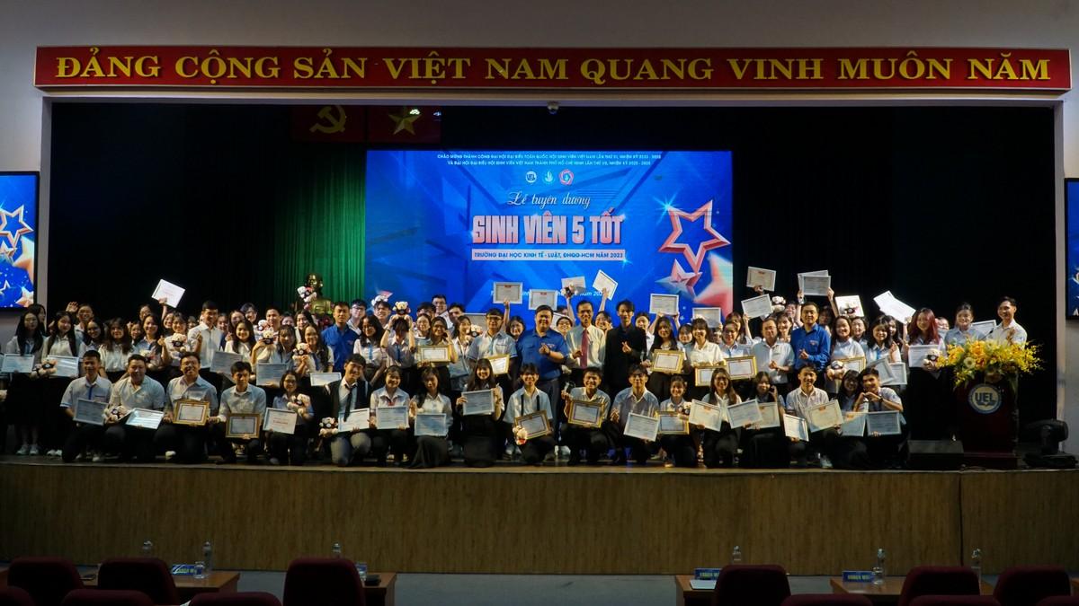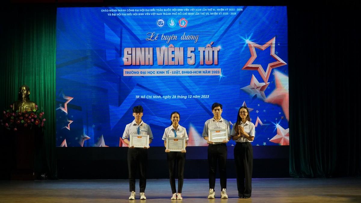 Tại Lễ tuyên dương, Đ/c Trần Thị Kiều Anh - Chủ tịch Hội Sinh viên Việt Nam Trường đã báo cáo tóm tắt Báo cáo tổng kết phong trào "Sinh viên 5 Tốt" năm 2023 và phát động thực hiện phong trào "Sinh viên 5 tốt" năm 2024. Bằng những hoạt động và định hướng hoạt động trong năm, Hội Sinh viên Việt Nam Trường Đại học Kinh tế - Luật đã cụ thể hóa các tiêu chí "5 Tốt" bao gồm: Đạo đức tốt - Học tập tốt - Thể lực tốt - Tình nguyện tốt - Hội nhập tốt một cách có hiệu quả. Và cũng từ thực tiễn phong trào, nhiều tấm gương "Sinh viên 5 Tốt" đã được phát hiện, phát triển cả về số lượng lẫn chất lượng, tiếp tục được bồi dưỡng giới thiệu vào hàng ngũ của Đảng. Những nỗ lực của các cấp cán bộ Hội và minh chứng cho việc sinh viên đã có tinh thần chủ động hơn với phong trào, là nền tảng để tiếp tục định hướng đẩy mạnh thực hiện phong trào "Sinh viên 5 tốt" trong những năm tới. Trong năm 2023, Trường Đại học Kinh tế - Luật có 740 sinh viên đạt danh hiệu "Sinh viên 5 Tốt" cấp Khoa, 151 sinh viên đạt danh hiệu "Sinh viên 5 Tốt" cấp Trường. Trong đó, có 12 sinh viên "Sinh viên 5 Tốt" tiêu biểu cấp Trường năm 2023, 36 sinh viên xuất sắc đạt danh hiệu "Sinh viên 5 Tốt" cấp Trường 02 năm liên tục, 17 sinh viên xuất sắc đạt danh hiệu "Sinh viên 5 Tốt" cấp Trường 03 năm liên tục. Ghi nhận 03 đơn vị đạt danh hiệu "Tập thể Sinh viên 5 Tốt" cấp Trường năm 2023 (Liên Chi hội Khoa Luật Kinh tế , Chi hội Quản trị Du lịch và Lữ hành Khóa 21, Chi hội Marketing Chất lượng cao Khóa 22).